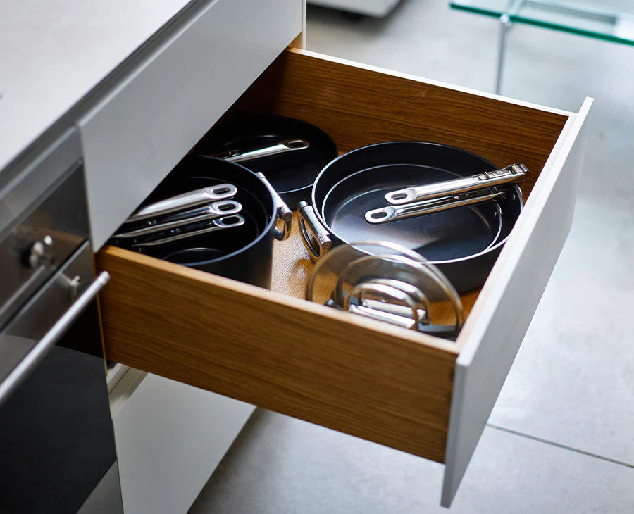The ingenious folding handle folds inwards and locks securely during cooking, providing the functionality of a traditional pan with the compactness of stackable cookware. It’s perfect for: