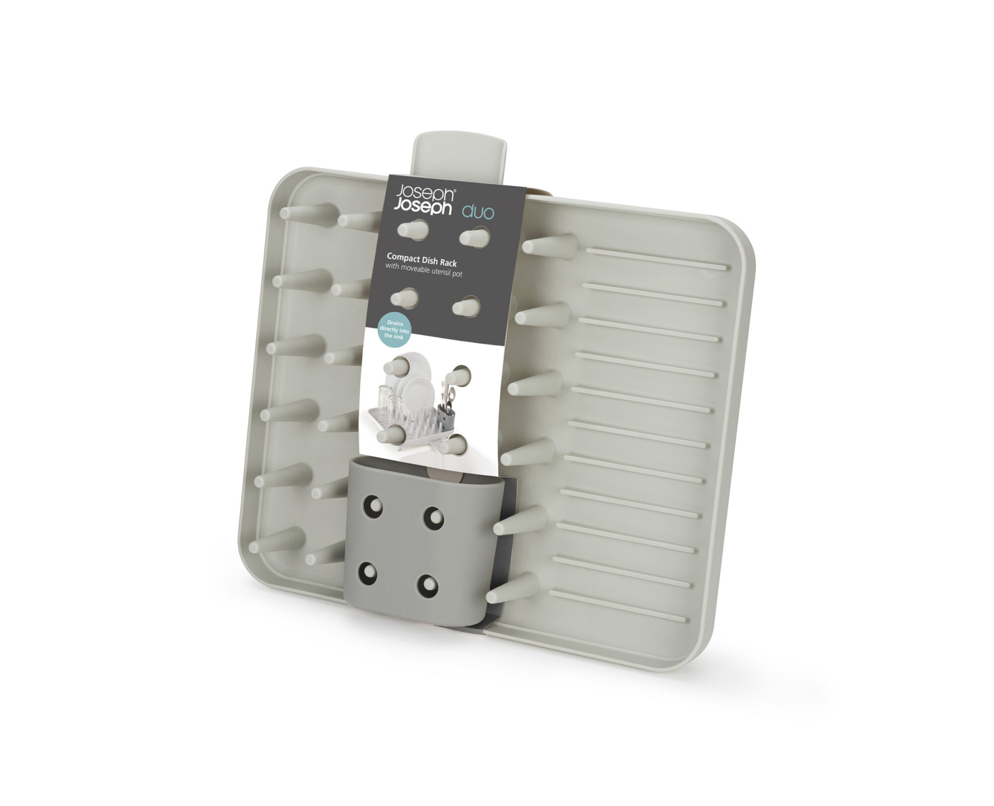 This compact dish rack features widely spaced prongs for all types of washing-up and a moveable utensil pot for draining cutlery. It has ridges and a sloping base that prevent water from being trapped inside glasses and crockery and a spout for draining directly into the sink. Non-slip feet on the base help keep the rack in place during use.