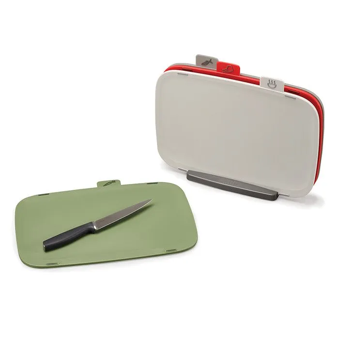 A set of cutting boards Duo from the English manufacturer Joseph Joseph will save time and help you maintain all hygiene standards. The four boards included are designed for meat, fish and all kinds of seafood, vegetables, baked goods. Color classification and special labels, which are depicted on each item, allow you to immediately get what you need. The boards have a small depression for the juice to drain. Cutting boards are stored in a compact case.