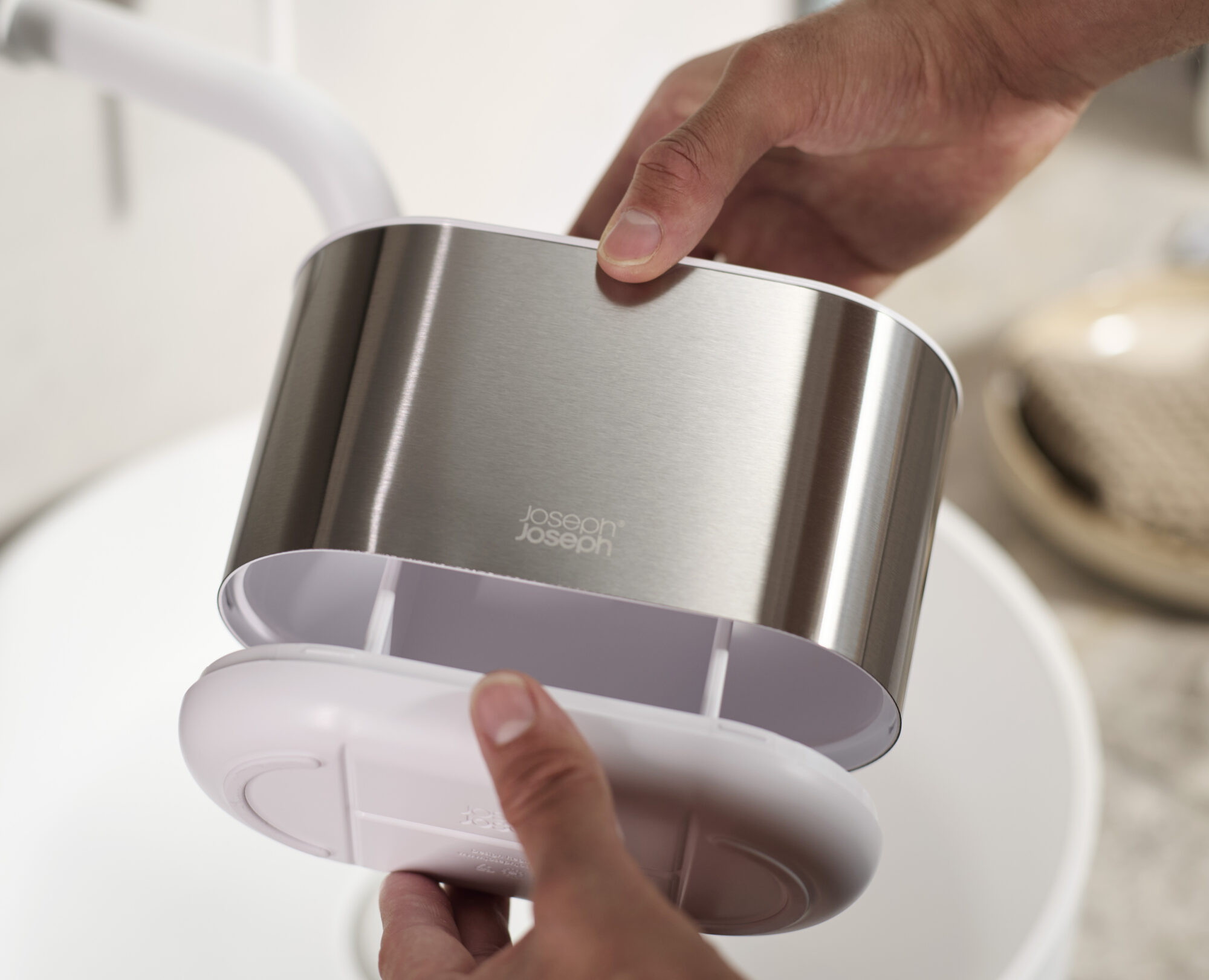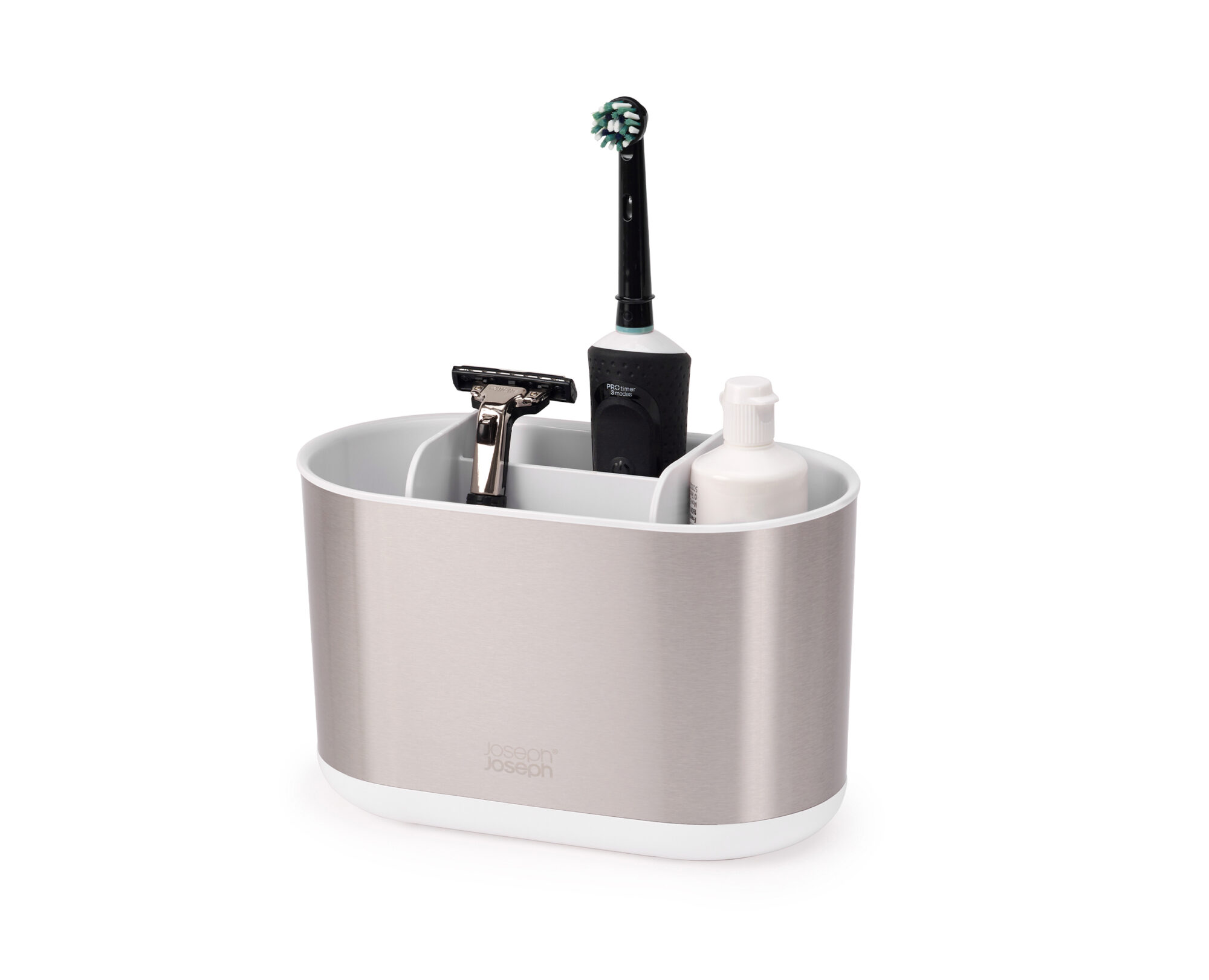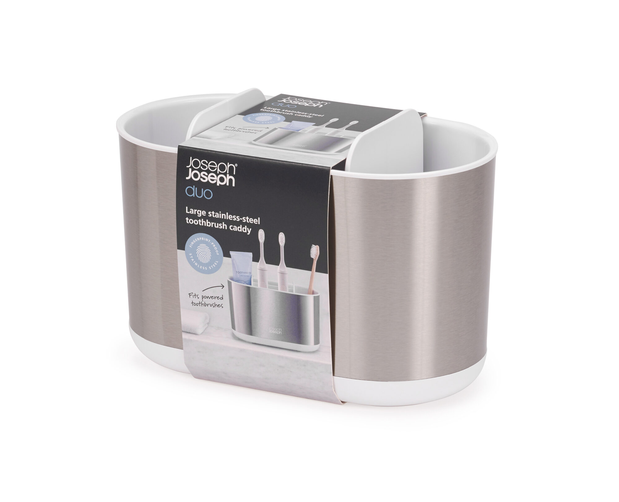 This polished stainless-steel large toothbrush caddy provides organized storage for your toothbrushes and toothpaste tubes. It features a divider for organized storage and is suitable for powered toothbrushes and toothpaste tubes. Perfect for storing by the sink, it dismantles for easy cleaning.
