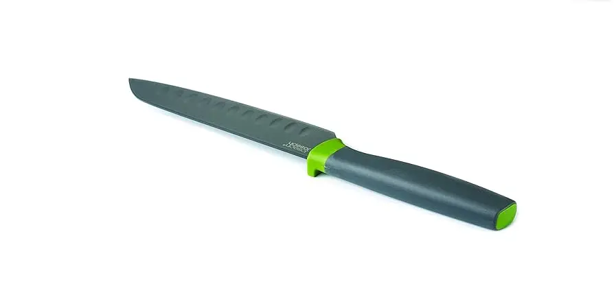 7″ Santoku Knife – a broader, all-purpose knife designed for ultra-precise chopping, dicing, and mincing; ideal for creating uniform cuts with its slightly curved blade and hollow-ground edge that reduces food sticking
