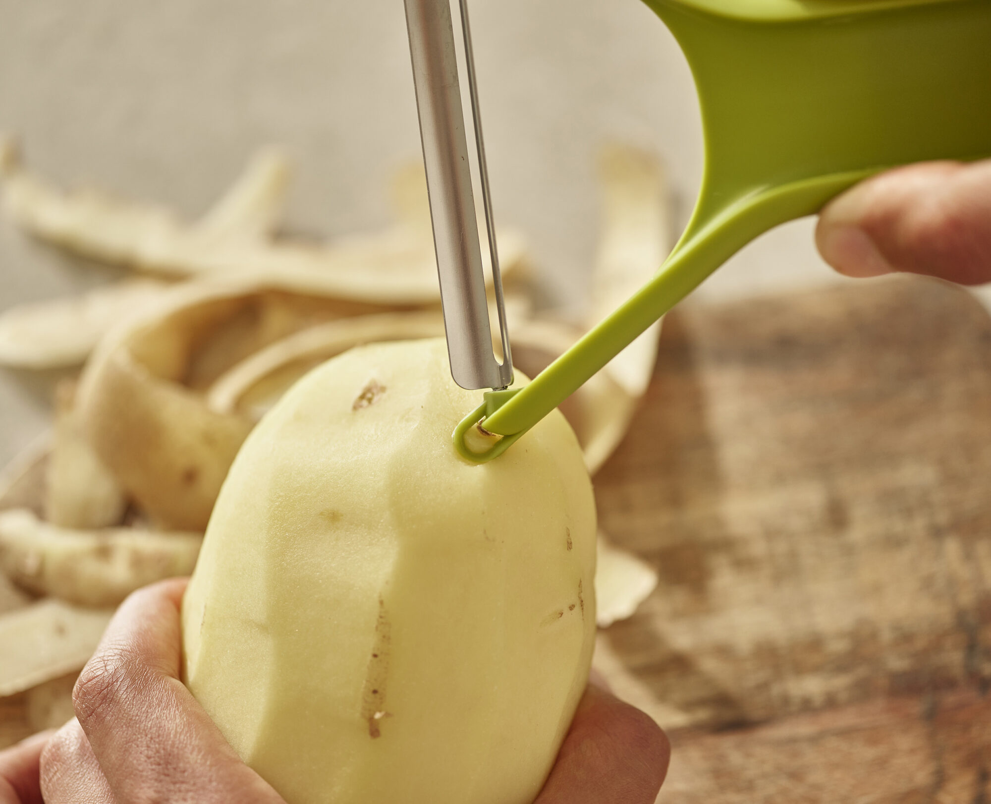 Place peelers on the top rack of the dishwasher or hand-wash with mild detergent and a soft sponge.