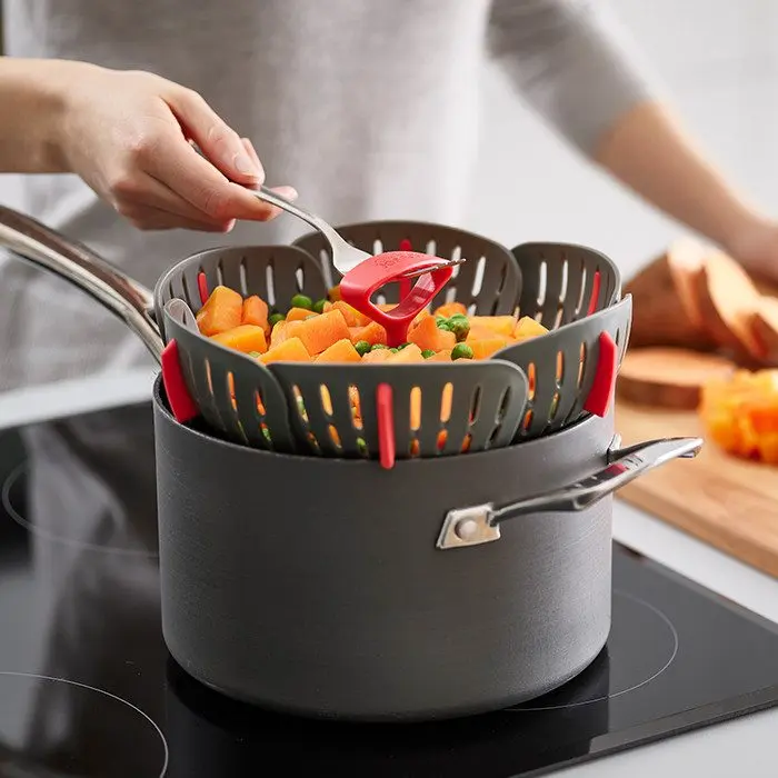 Enter the folding steamer basket that adjusts to your pan, folds when done, and protects your cookware. Toss it in the dishwasher after. That?s modern cooking made smart.