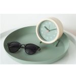 Jam alarm desktop oleh Karlsson. Kotak baja dengan lapisan kayu dengan warna alami kayu. Mekanisme aliran kontinu senyap.