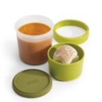 This innovative leakproof container features a large base compartment for soups of stews, and a smaller top compartment thats perfect for accompaniments, such as bread or croutons.