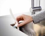 After rinsing, rest the brush on the sink edge using its built-in grip