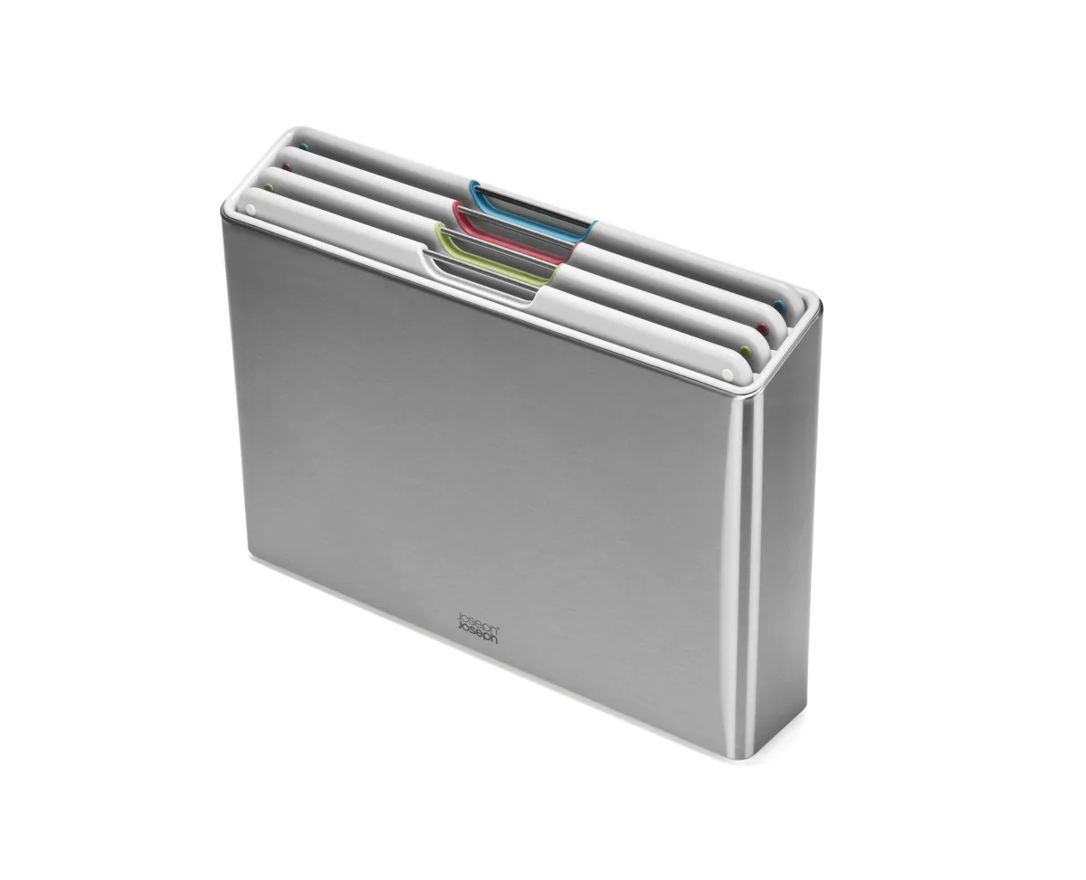 Upgrade your food preparation with the Folio™ Steel chopping board set. Featuring four colour-coded boards in a sleek stainless-steel case, it helps reduce cross-contamination while keeping your kitchen organised and stylish.
