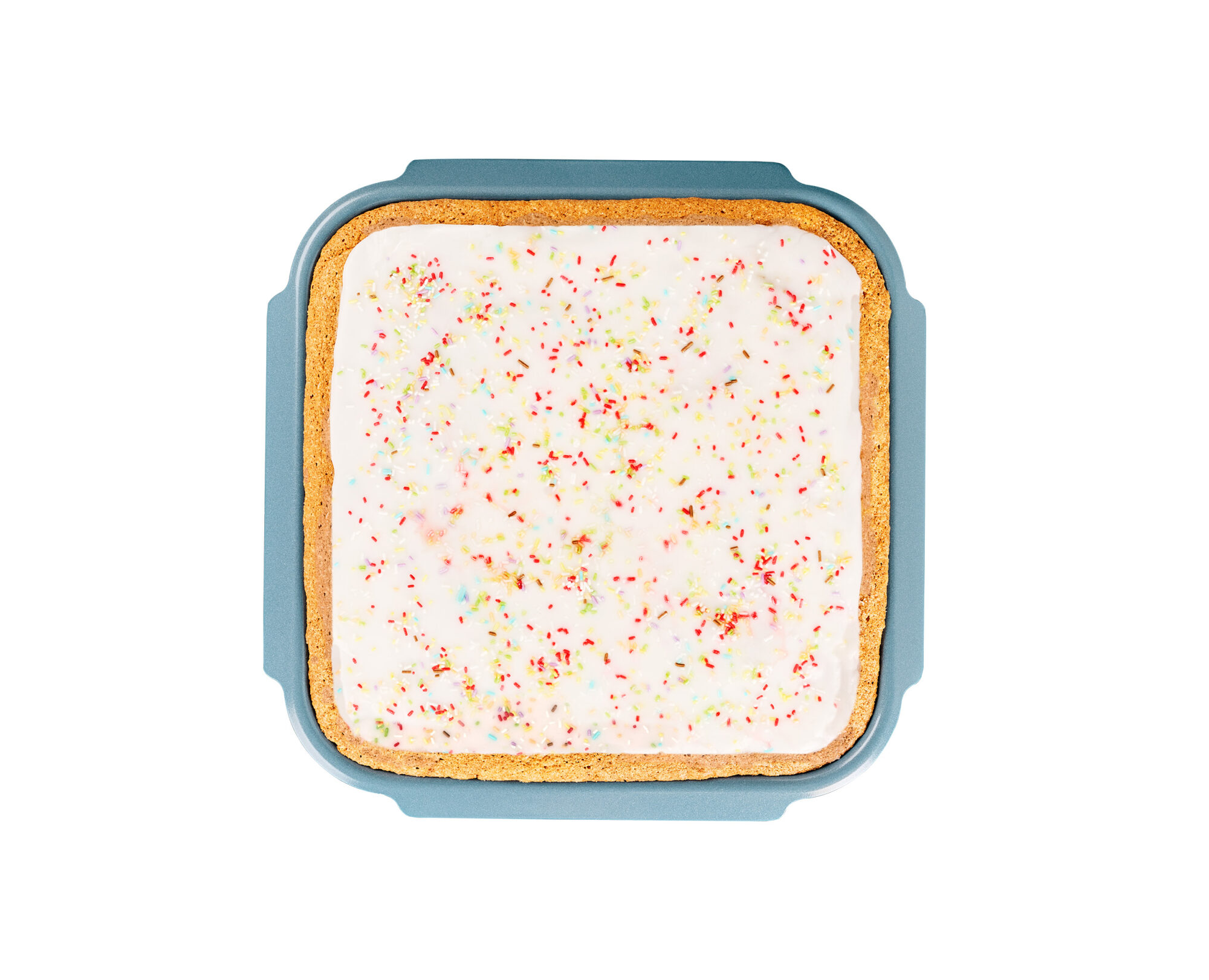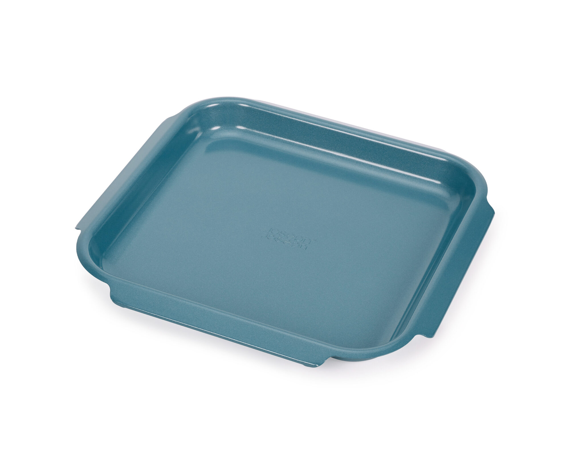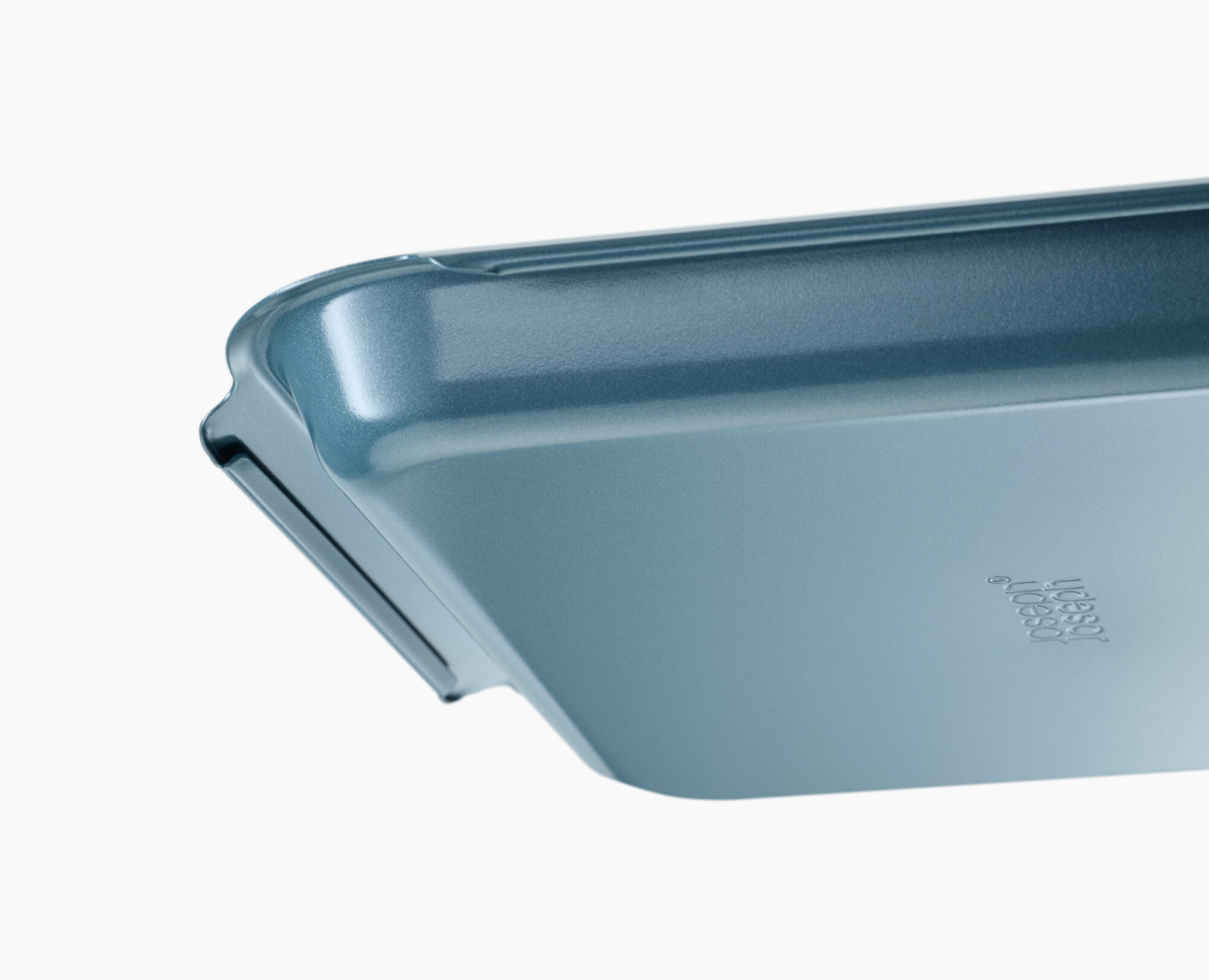 The Joseph Joseph Nest™ Bake Medium Non-Stick Baking Tray is designed to optimize your baking experience with smart, space-saving functionality. Made from heavy-gauge carbon steel, it delivers excellent durability and even heat distribution for consistent results. The tray features a dual-layer non-stick coating that is free from PTFE, PFAS, PFOA, lead, and cadmium, making food release and cleanup effortless. Easy-pull handles on all sides provide a secure grip, even when wearing oven gloves. Its stackable design nests seamlessly with other Nest™ Bake items, helping save space and promote airflow to reduce surface wear. Oven safe up to 232°C (450°F), this tray is an ideal addition to any modern kitchen.