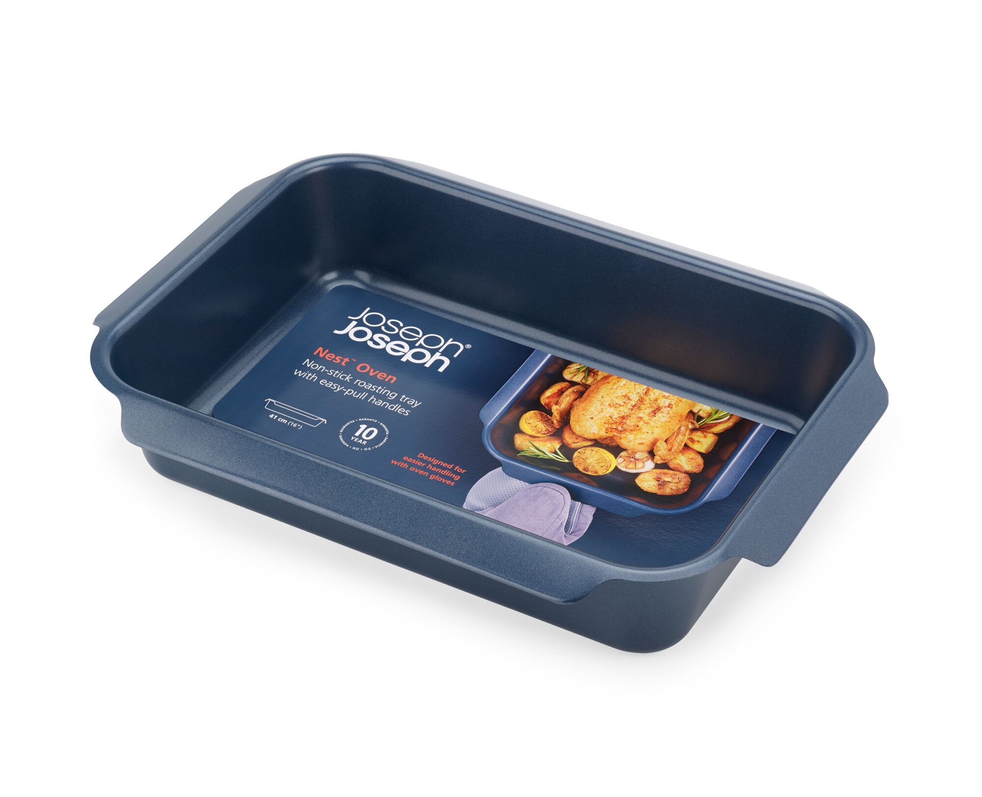 The Joseph Joseph Nest™ Oven Large Non-Stick Roasting Tray is designed to enhance your cooking experience with a space-saving, stackable design. Crafted from heavy-gauge carbon steel, it offers excellent durability and even heat distribution for consistent results. The dual-layer non-stick coating is free from PTFE, PFAS, PFOA, lead, and cadmium, ensuring easy food release and effortless cleaning. Featuring easy-pull handles on all sides, it provides a safe and secure grip even when wearing oven gloves. Its nesting design allows for compact storage and airflow to prevent scratching. Oven safe up to 232°C, this roasting tray is a smart and reliable choice for every home cook.