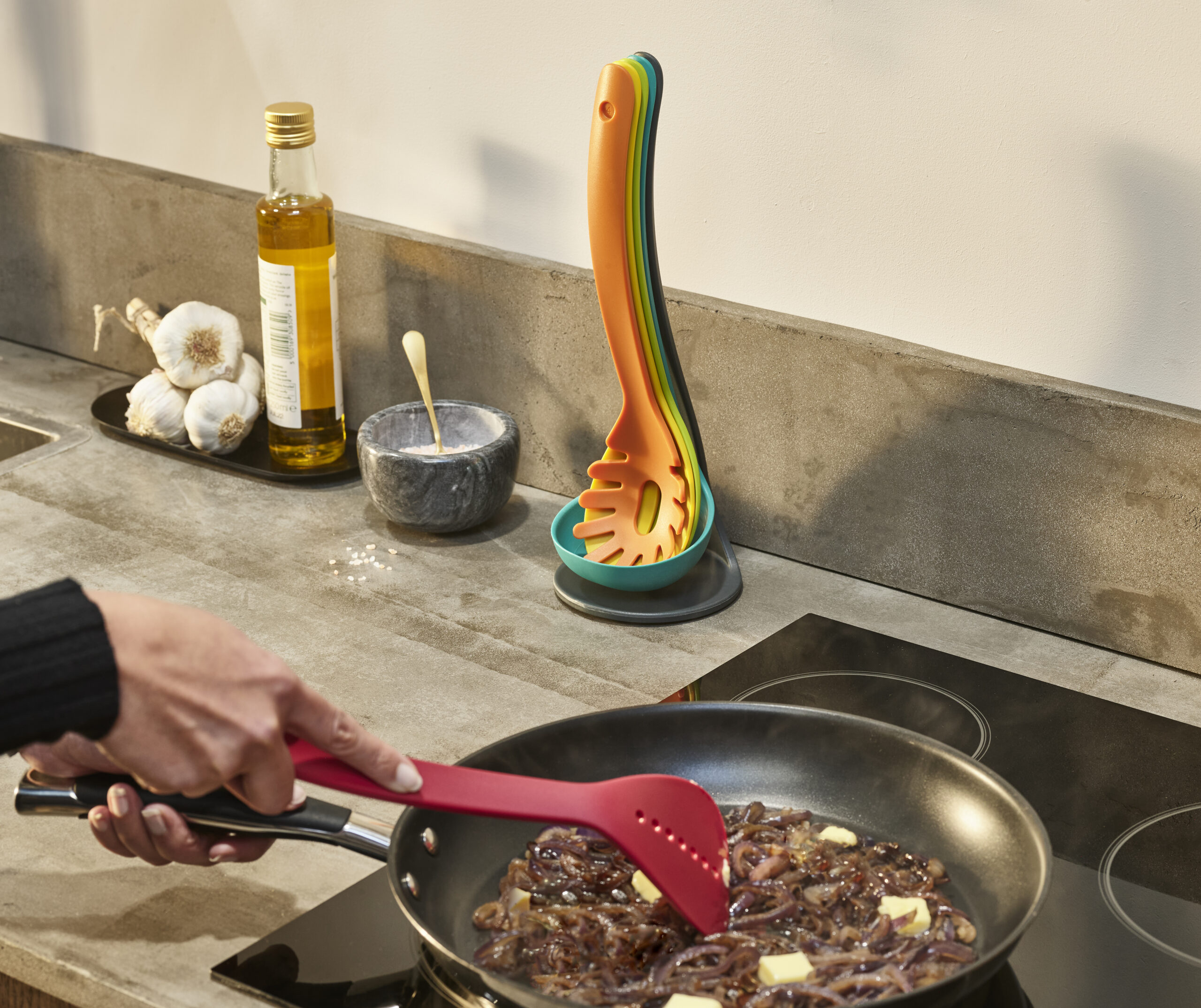The colour-coded utensils aren’t just for visual appeal—they enhance functionality. Each tool is finished in a unique, vibrant hue that makes it easy to identify at a glance. Whether you’re grabbing the spaghetti server or reaching for the ladle, the distinct colours help you quickly find what you need without hesitation. It’s a small feature that adds efficiency and visual charm to your kitchen workflow.