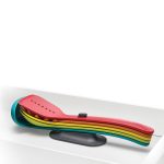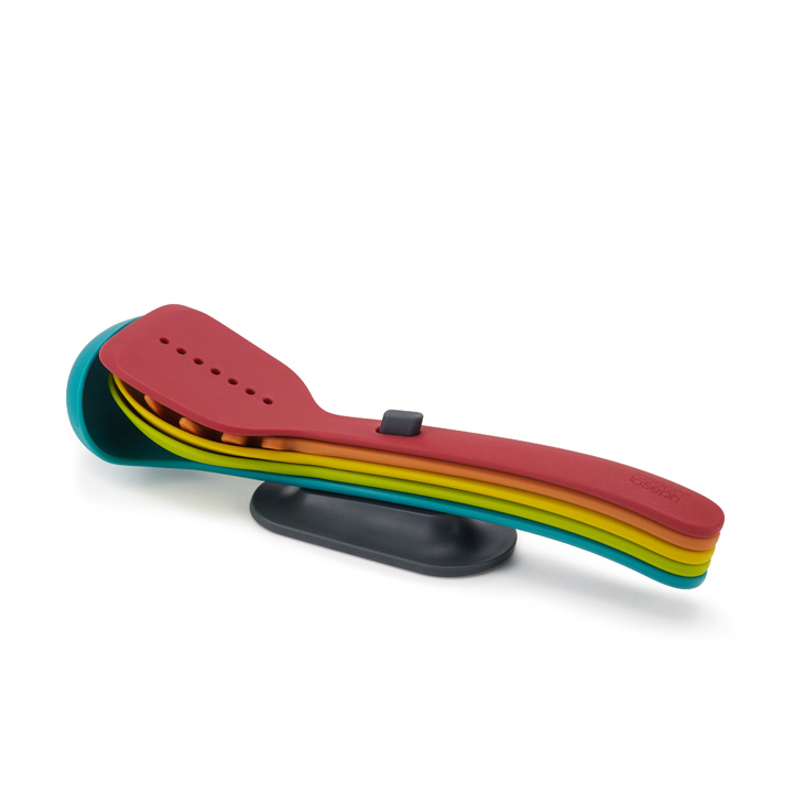 Nest is the ultimate collection of practical, space-saving kitchenware comprising a range of food preparation sets.Their innovative design allows the individual elements within each set to be stacked ideally together, thereby occupying the absolute minimum amount of space, wherever they are stored.Nest Utensils are the addition to the range, comprising 5 essential kitchen tools in a compact, self-supporting design, which not only looks great in the kitchen but eliminates the need for an additional utensil pot.The set contains a slotted spatula, spaghetti server, slotted spoon, solid spoon and a ladle.When nested the tools are held securely in place by small magnets in the handles. Made from toughened nylon, all tools are heat-resistant up to 240C/464F. Dishwasher safe.