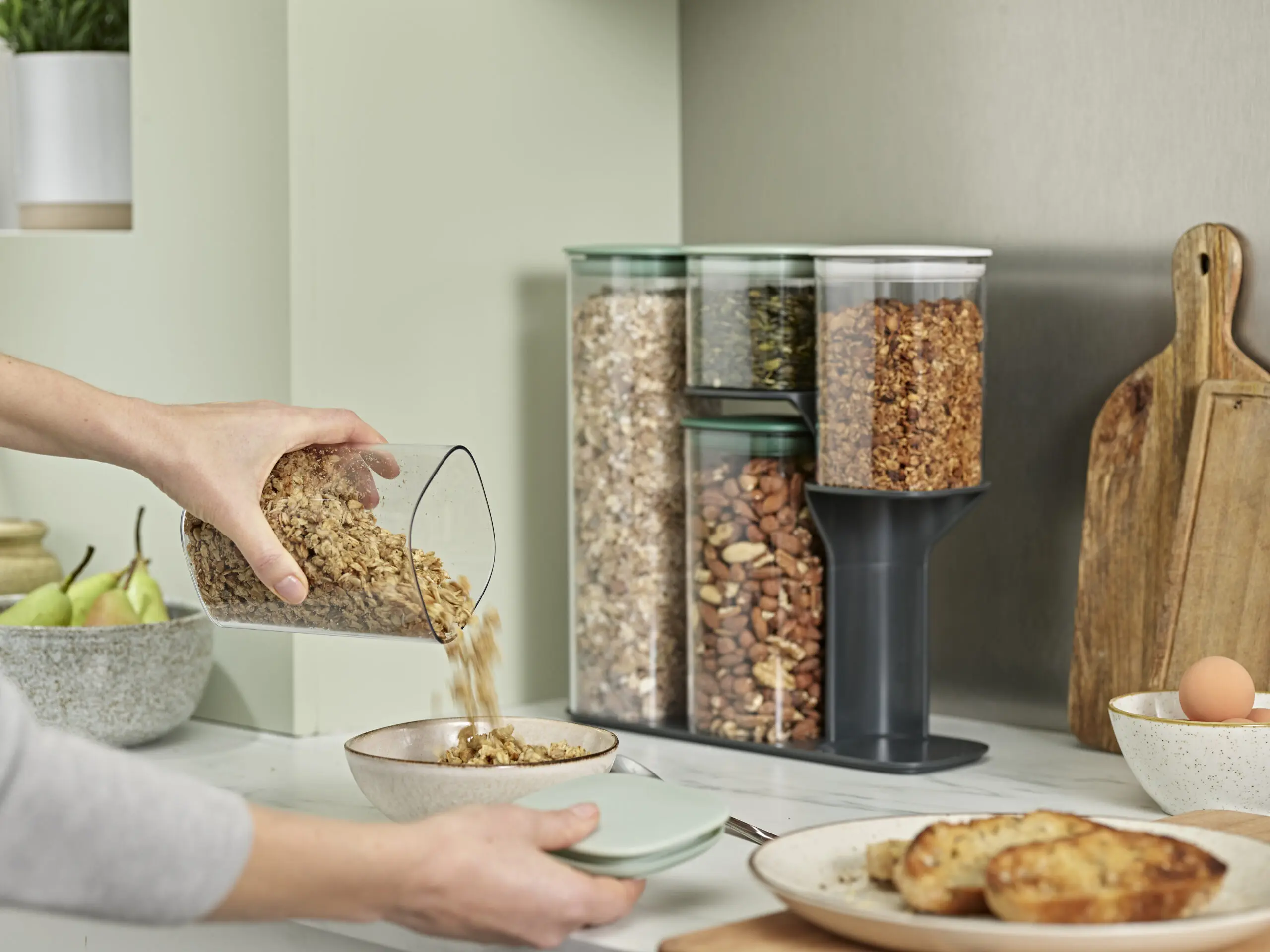 Unlike typical vertical jar stacks, the Podium™ system uses an angled base with locating guides that support each container individually. This thoughtful design allows you to slide any container out smoothly without disrupting the others. Whether you’re reaching for flour, rice, pasta, seeds, or snacks, the non-slip stand ensures stability, while raised locating bases keep each container securely in place. The result is a truly modular solution that brings order and ease to everyday ingredient access.