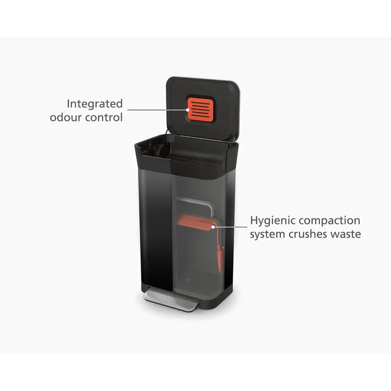 - Easy to use compactor allows you to hold up to 90-litres of waste in the space of a 30-litre bin.